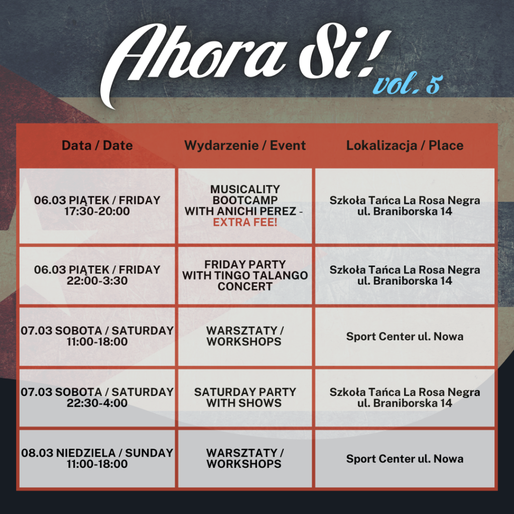 Zapraszamy na trzy dni pełne tańca, muzyki i dobrej zabawy! Czekają na Ciebie inspirujące warsztaty, koncerty i wieczorne pokazy. Baw się, rozwijaj swoje pasje i twórz wspomnienia!